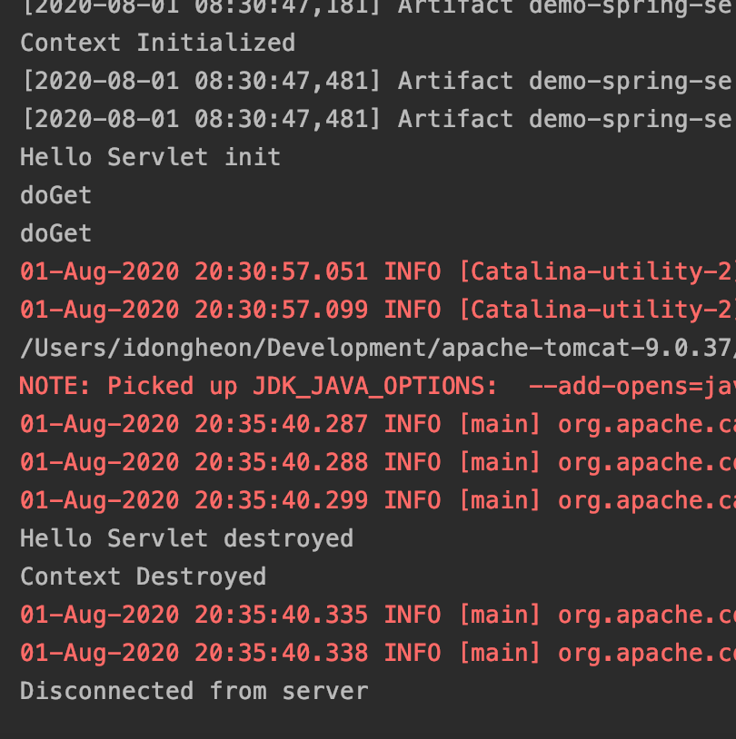 종료는 반대로, 서블릿이 먼저 종료된 다음 컨텍스트가 종료되는 것을 볼 수 있다.