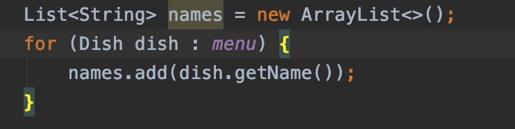 아래는 컬렉션(외부반복)을 이용하여 음식들로부터 음식 이름만 획득하는 코드이다.