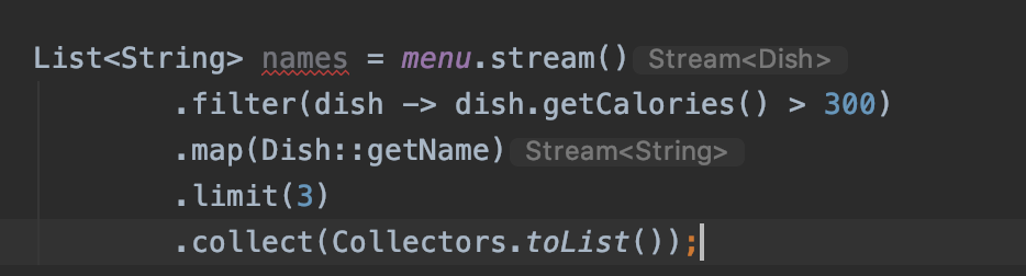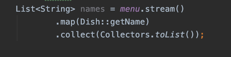 아래는 내부반복(스트림)을 이용하여 음식들로부터 음식 이름을 추출하는 코드이다.