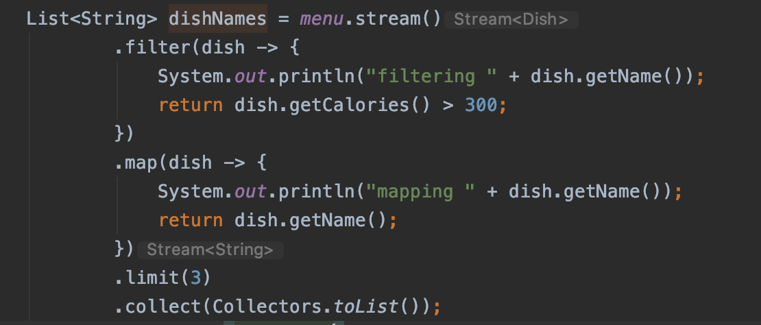 위와 같은 코드에서는, filter, map, limit이 중간연산, collect가 최종연산이다.