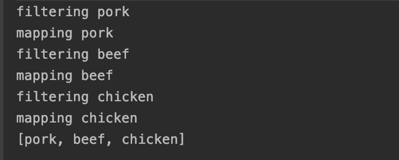 위 결과를 보면 pork 에 대해 filter연산과 map연산이 수행된 후 beef에 대한 연산이 시작되는 것을 알 수 있다.